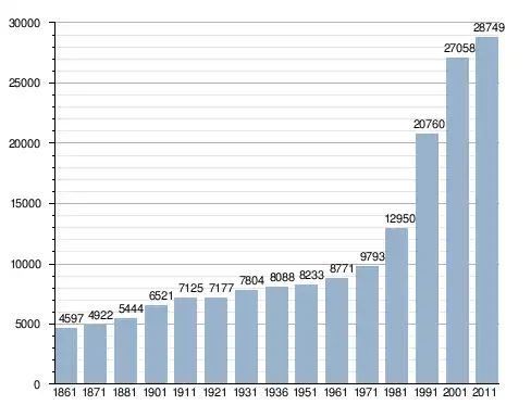 في سنة 1861 بلغ عدد السكان 4٬597 نسمة، وتطور العدد ليصل في سنة 2011 لـ 28٬749 نسمة.