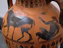 رسم على قارورة إغريقية عثر عليها في إيطاليا. الرسم يمثل آرجوس مع آيو (والتي تبدو على شكل بقرة صغيرة)