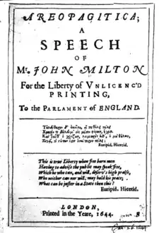 - Milton, John (1644). Areopagitica, A Speech of Mr. John Milton for the Liberty of Unlicenc'd Printing to the Parliament of England (الطبعة 1). London. مؤرشف من الأصل في 08 ديسمبر 2019. اطلع عليه بتاريخ 01 فبراير 2016. الوسيط