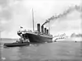 آر إم إس تايتانيك تغادر بلفاست واثنين من القاطرات توجهها 2 أبريل 1912(في الواقع كان هناك خمسة القاطرات المستخدمة)