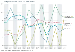 وتركز السياسات العامة التي تنتهجها حكومات آسيا الوسطى على الحفاظ على الميزان التجاري وتقليل الدين العام وتكديس الاحتياطيات الوطنية. وقد خرجوا سالمين نسبيًا من الأزمة المالية العالمية في 2008-2009. تعثر النمو لفترة وجيزة فقط في كازاخستان وطاجيكستان وتركمانستان، حيث نما الاقتصاد بأكثر من 7٪ سنويًا في المتوسط بين عامي 2008 و2013. وحققت تركمانستان نموًا مرتفعًا بشكل غير عادي 14.7٪ في عام 2011.[28]