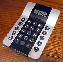 المفاتيح التالية شائعة في معظم حاسبات الجيب. في حين أن ترتيب الأرقام قياسي ، فإن مواضع المفاتيح الأخرى تختلف من نموذج إلى آخر ؛ الرسم التوضيحي مثال.[3]