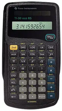 في عام 1973 ، قدمت شركة أدوات تكاس (TI) SR-10 ، ( قاعدة الشريحة التي تشير إلى SR ) وهي آلة حاسبة جيب إدخال جبري باستخدام تدوين علمي مقابل 150 دولارًا. بعد فترة وجيزة من ظهور SR-11 مفتاحًا إضافيًا لإدخال ط (π). تبعه في العام التالي SR-50 الذي أضاف وظائف السجل والتثليث للتنافس مع HP-35 ، وفي عام 1977 تم تسويق خط TI-30 على نطاق واسعوالذي لا يزال يتم إنتاجه.