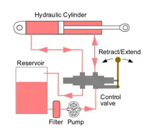 لكي ينجز السائل الهيدروليكي عمل ما، يحب عليه أن يتدفق إلى المحرك الهيدروليكي، ثم يعود إلى مستودع السائل. يصفى السائل ويعاد ضخه. الطريق الذي قطعه السائل الهيدروليكي يسمى بالدارة الهيدروليكية، وهي ذات عدة أنواع. تستخدم " الدارات ذات المركز المفتوح " في المضخات التي تعطي جريان مستمر. يعاد الجريان إلى الخزان خلال المركز المفتوح لصمام التحكم، وهكذا عندما يتمركز صمام التحكم، فإنه يفتح طريقاً مفتوحاً للسائل للعودة إلى الخزان ولا يضخ السائل إلى ضغط عالٍ. أما إذا تم تفعيل صمام التحكم، فإنه يسد الطريق من وإلى الخزان. سيرتفع ضغط السائل الهيدروليكي ليواجه أي مقاومة طالما أن للمضخة حمل ثابت. وإذا ارتفع الضغط جداً، فإن السائل يعود إلى الخزان عبر صمام الأمان. ويمكن تركيب عدة صمامات تحكم على التسلسل. يمكن في هذا النوع من الدارات استخدام مضخات رخيصة ذات إزاحة ثابتة. " الدارات ذات المركز المغلق " تعطي ضغطا كاملا على صمامات التحكم بغض النظر إن كان الصمام مغلقاً أم مفتوحاً. تغير المضخة معدل الجريان فيها، فتضخ كمية صغيرة من السائل الهيدروليكي مالم يفتح المشغل الصمام. وبالتالي فإن صمام التحكم لا يحتاج لأن يكون موصولا بمركز مفتوح ليعيد السائل إلى الخزان. يمكن ربط الصمامات على التوازي بحيث يكون الضغط متساوي على كل الصمامات.