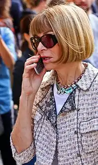![]() A woman with brownish hair, lit by the sun from outside the top right of the image, is seen from her front left. She is wearing a light-colored short-sleeved collared jacket with elaborate jewelry, a white top beneath it, and sunglasses. In her right arm she is holding a cell phone to her mouth; she is apparently in the midst of a conversation وينتور في أسبوع الموضة في ميلانو، سبتمبر 2013 | |