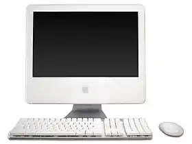 الجهاز محمول على ذراع ألمنيومية . تفتخر أبل بأن الآيماك هو أنحف حاسوب مكتبي في السوق، وكان الجهاز يباع في ثلاثة إصدارات ( 17" بوصة بمعالج 1.6 جيجاهرتز ; 17" بوصة بمعالج 1.8 جيجاهرتز ; 20" بوصة بمعالج 1.8 جيجاهرتز ) وأيضاً على جهاز للمؤسسات التعليمية لا يوجد فيه قارئ أقراص مضغوطة ، مودم، وكرت رسومات جي فورس إم إكس4000 .
