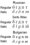 | أبجدية سيريلية أبجدية لاتينية IPA | А а A /a/ | Б б B /b/ | В в V /ʋ/ | Г г G /g/ | Д д D /d/ | Ђ ђ Đ /dʑ/ | Е е E /ɛ/ | Ж ж Ž /ʒ/ | З з Z /z/ | И и I /i/ |
