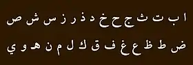| ألف | باء | تاء | ثاء | جيم | حاء | خاء | دال | ذال | راء | زاي | سين | شين | صاد | ضاد | طاء | ظاء | عين | غين | فاء | قاف | كاف | لام | ميم | نون | هاء | واو | ياء |