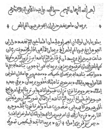 وتُشير الروايات المتواترة إلى أن الكتابة العربية اشتقت من الخط الحميري (المسند)،[44][45][46][lower-alpha 2] الذي انتقل إلى العراق في عهد المناذرة، حيث تعلمه أهل الحيرة،[47] ثم تعلمه أهل الأنبار،[48] ثم انتقل إلى الحجاز، عن طريق القوافل التجارية والأدبية؛[49] وقد أخرج الحافظ أبو طاهر السلفي في الطيوريات بسنده عن الشعبي ما يؤيد ذلك فقال: «أول العرب الذي كتب بالعربية حرب بن أمية، تعلم من أهل الحيرة، وتعلم أهل الحيرة من أهل الأنبار».[50][51][52] وقال أبو بكر بن أبي داود في كتاب المصاحف: «حدثنا عبد الله بن محمد الزهري حدثنا سفيان عن مجالد عن الشعبي قال: سَألْنَا المهاجرين من أين تعلمتم الكتابة قالوا: تعلمنا من أهل الحيرة سألنا أهل الحيرة: من أين تعلمتم الكتابة قالوا: من أهل الأنبار».[53][54][55] وقال تقي الدين المقريزي: «القلم المسند هو القلم الأول من أقلام حمير وملوك عاد».[56] وجاء في ملحق الجزء الأول من تاريخ ابن خلدون للكاتب شكيب أرسلان: «يذهب علماء الإفرنج ومنهم المستشرق مورتينز الألماني إلى أن أصل الكتابة بالحروف الهيروغليفية كان في اليمن، وهو يعتقد أن اليمانيين هم الذين اخترعوا الكتابة وليس الفينيقيون هم الذين اخترعوها كما هو الرأي المشهور، وهو يستدل على رأيه هذا ويقول أن الفينيقيين إنما بنوا كتابتهم على الكتابة العربية اليمانية، ثم إن اليونانيين أخذوا الكتابة عن الفينيقيين، وعنهم أخذ الرومانيون، فيكون العرب هم الذين أوجدوا الكتابة في هذا العالم، وبهذا الاعتبار هم الذين أوجدوا المدنية».[57] وقال ابن خلدون في مقدمته في فصل أن الخط والكتابة من عداد الصنائع الإنسانية: «ولقد كان الخط العربي بالغًا ما بلغه من الأحكام والاتقان والجودة في دولة التبابعة، لما بلغت من الحضارة والترفه، وهو المسمى بالخط الحميري، وانتقل منها إلى الحيرة، لما كان بها من دولة آل المنذر نسباء التبابعة في العصبية والمجددين لملك العرب بأرض العراق، ولم يكن الخط عندهم من الإجادة كما كان عند التتابعة، لقصور ما بين الدولتين، وكانت الحضارة وتوابعها من الصنائع وغيرها قاصرة عن ذلك. ومن الحيرة لقنه أهل الطائف وقريش فيما ذكر، يقال أن الذي تعلم الكتابة من الحيرة هو سفيان بن أمية، ويقال حرب بن أمية، وأخذها من أسلم بن سدرة وهو قول ممكن. وأقرب ممن ذهب إلى أنهم تعلموها من إياد أهل العراق قول شاعرهم: قوم لهم ساحة العراق إذا … ساروا جميعا والخط والقلم. وهو قول بعيد لأن إيادًا وإن نزلوا ساحة العراق فلم يزالوا عل شأنهم من البداوة، والخط من الصنائع الحضرية. فالقول أن بأن أهل الحجاز إنما لقنوها من الحيرة، ولقنها أهل الحيرة من التبابعة وحمير هو الأليق من الأقوال، وكان لحمير كتابة تسمى المسند حروفها منفصلة، وكانوا يمنعون من تعلمها إلا باذنهم، ومن حمير تعلمت مصر الكتابة العربية، إلا أنهم لم يكونوا مجيدين لها شأن الصنائع إذا وقعت بالبدو، فلا تكون محكمة المذهب ولا مائلة إلى الإتقان. كانت كتابة العرب بدوية مثل أو قريبًا من كتابتهم لهذا العهد، أو نقول إن كتابتهم لهذا العهد أحسن صناعة، لأن هؤلاء أقرب إلى الحضارة ومخالطة الأمصار والدول، وأما مضر فكانوا أعرق في البدو وأبعد عن الحضر من أهل اليمن وأهل العراق وأهل الشام ومصر، فكان الخط العربي لأول الإسلام غير بالغ إلى الغاية من الإحكام والاتقان والاجادة، ولا إلى التوسط لمكان العرب من البداوة والتوحش وبعدهم عن الصنائع».[lower-alpha 3]