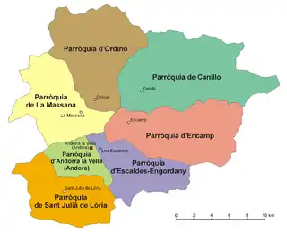 | # | أبرشية | أيزو 3166-2:AD | المساحة كم² | السكان | ||