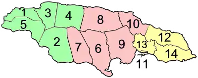 إدارياً تنقسم جامايكا إلى 14 إبريشية ( Parish ). وتجمع في 3 مقاطعات ( County ) تاريخية ليس لها إدارة. كل إبريشية لها ساحل ولا توجد منطقة مغلقة.