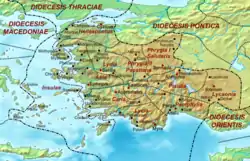 ![]() خارطة لأبرشية آسيا التابعة للإمبراطورية البيزنطية، حيث تظهر مقاطعاتها ومراكزها وأهم مدنها في عام 400 م. | ||||||