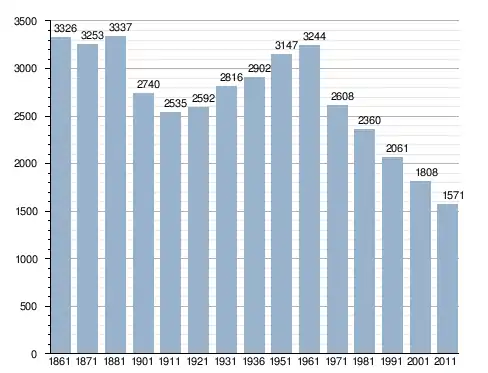 في سنة 1861 بلغ عدد السكان 3٬326 نسمة، وتطور العدد ليصل في سنة 2011 لـ 1٬571 نسمة.