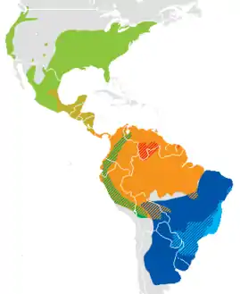![]() مناطق انتشار أنواع جنس الأبوسوم الستَّة في الأمريكيَّتين | |