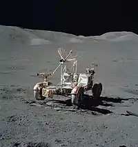 ![]() قائد أبولو 17 سيرنان في المقدمة، وخلفه إيفانز والجيولوجي شميت. قائد أبولو 17 سيرنان في المقدمة، وخلفه إيفانز والجيولوجي شميت. | |