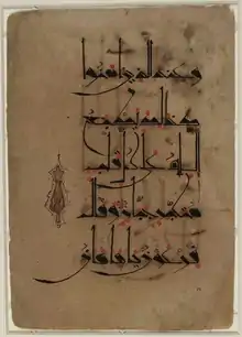 بكسر كلمة «رَسُولُهُ» بدلاً من ضمّها مما يغير معنى الآية، وتفيد بأن الله يبرأ من رسوله، فانطلق أبو الأسود لوقته إلى الأمير وقتها زياد بن أبيه، وقصّ عليه ما سمع، وسأله أن يدفع له كاتبًا ليضع كتابًا في اللغة، فأتى به فقال له أبو الأسود: «إذا رأيتني قد فتحت فمي بالحرف فانقط نقطة أعلاه، وإذا رأيتني قد ضممت فمي، فانقط نقطة بين يدي الحرف، وإن كسرت، فانقط نقطة تحت الحرف، فإذا أتبعت شيئًا من ذلك غُنّة فاجعل مكان النقطة نقطتين»،[29] فكان هذا نهج أبي الأسود في تشكيل الحروف، لذا فهو يعد أول من نقط المصاحف، وأخذ عنه هذا النحو عنبسة الفيل.[4] وكان أول ما وضع أبو الأسود أبواب الفاعل والمفعول والمضاف، وحروف الرفع والنصب والجر والجزم.[4][30]