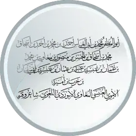 ![]() نسب العلامة الأكمل أبو المظفر محمد بن أبي العباس أحمد بن محمد بن أحمد بن إسحاق بن محمد بن إسحاق بن الحسن بن منصور بن معاوية بن محمد بن عثمان بن عنبسة بن عتبة بن عثمان بن عنبسة بن أبي سفيان بن حرب بن أمية الأموي العنبسي المعاوي الأبيوردي اللغوي ، شاعر وقته ، وصاحب التصانيف ، فالواسطة بينه وبين أبي سفيان خمسة عشر أبا . | |