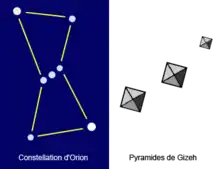 نظرية ارتباط الجبار ، كما شرحها المؤلفون المشهورون غراهام هانكوك و روبرت بوفال ، [24] يستند إلى الارتباط الدقيق المقترح للأهرامات الثلاثة في الجيزة مع النجوم الثلاثة النطاق (الجبار) ، نيلم (نجم) و المنطقة (الجبار) ، تشكل النجوم حزام الجبار ، في المواضع النسبية التي تحتلها هذه النجوم في 10,500 قبل الميلاد، يجادل المؤلفون بأن العلاقة الجغرافية لأبو الهول وأهرامات الجيزة و النيل تتوافق مباشرة مع كوكبة الأسد ، كوكبة الجبار و درب التبانة على التوالي. تعتبر النظرية علم الآثار الزائف من خلال المنح الدراسية السائدة. [25] [26] [27]