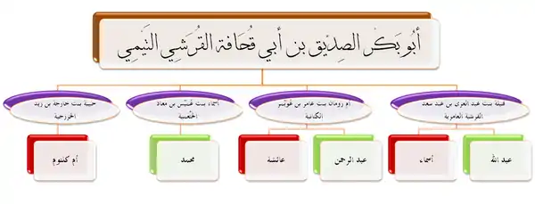 | النسب | أبوه: أبو قحافة عثمان بن عامر بن عمرو التيمي القرشي أمه: أم الخير سلمى بنت صخر بن عامر التيمية القرشية زوجاته: قتيلة بنت عبد العزى، وأم رومان بنت عامر، وأسماء بنت عميس، وحبيبة بنت خارجة. ذريته: عبد الرحمن، وعبد الله، ومحمد، وأسماء، وعائشة، وأم كلثوم. |