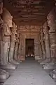 والمدخل نفسه متوج بنقش ضئيل البروز، يمثل صورتين للملك وهو يعبد الصقر ذو الرأس راع حاراختي التي يقف تمثالها في مشكاة كبيرة.[4] وهذا الإله يمسك في يده اليمنى عقد الهيروغليفية فن الكتابة المصرية الفرعونية المستخدم والريشة في حين يمسك في يده اليسرى معات إلهة الحقيقة والعدالة، وهذا لا يقل عن نبتة من اللازهرية نبتة للعملاق رمسيس الثاني واسم العرش المستخدم ماعت - ري. وعلى رأس واجهة المبنى متوج بصف من 22 قرد الرباح وأذرعتهم مرفوعة في الهواء، ويفترض أنهم يعبدون الشمس المشرقة. وملامح بارزة أخرى لواجهة المبنى هو لوحة يسجل فيها زواج رمسيس من ابنة الملك هاتسيلي الثالث، والتي أدت إلى السلام بين مصر وهيتيتس.