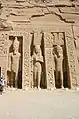 معبد حتحور ونفرتاري، والمعروف أيضا باسم المعبد الصغير، وقد بني على بعد حوالى مائة متر إلى الشمال الشرقي من معبد رمسيس الثاني وكانت قد خصصت للإلهة Hathor حتحور، ورمسيس الثاني، وزوجته نفرتاري. وفي الواقع هذه هي في المرة الثانية في التاريخ المصري القديم التي يكرس فيها معبد للملكة. والمرة الأولى كانت عندما خصص أخناتون معبد لزوجته الملكة العظيمة نفرتيتي.[4] وقطع الصخر التي في الواجهة مزينة بمجموعتين من العمالقة، وتفصل بالبوابة الكبيرة. فان ارتفاع التماثيل أكثر بقليل من عشرة امتار للملك والملكة. على الجانب الآخر من البوابة هما تماثيل للملك، مرتديا التاج الأبيض لصعيد مصر (ضخم للجنوب) والتاج المزدوج (ضخم للشمال)؛ هذه التماثيل يحيط بها تماثيل الملكة والملك. ما يثير الدهشة حقا هو أنه للمرة الأولى في الفن المصري، ويكون تمثال الملك والملكة يكونوا متساوين في الحجم.[4]