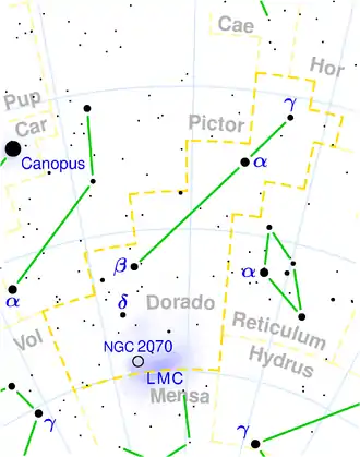 ترى سحابة ماجلان الكبرى في هذه الكوكبة، وتلك السحابة LMC تبعد عنا نحو 170.000 سنة ضوئية.