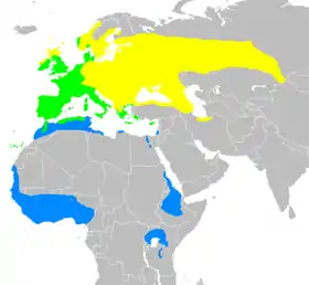 ![]() زائر صيفي متكاثر (النطاق تقريبي)مقيم حول العام زائر شتوي | |