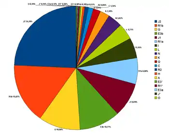 - J1 = 9٪ - [122] تطابق بين سكان شبه الجزيرة العربية وداغستان (تتراوح بين 3٪ من الأتراك الموجودين حول قونية إلى 12٪ في الأكراد).