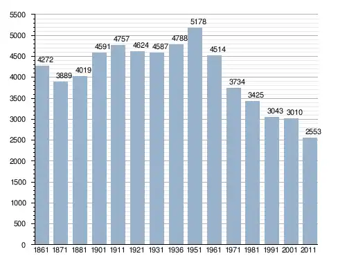 في سنة 1861 بلغ عدد السكان 4٬272 نسمة، وتطور العدد ليصل في سنة 2011 لـ 2٬553 نسمة.