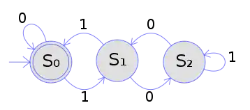 الصورة على اليمين هو تمثيل لـ آلة محدودة قطعية باستخدام النماذج الرياضية. في هذه الآلة هناك ثلاث حالات : S0, S1 و S2 (حيث كل دائرة تدل على حالة). هذه الآلة تقبل عدد محدود من ال 0 والـ 1 كمدخلات. في كل حالة من الثلاث حالات هناك سهم انتقال من حاله إلى أخرى. في حالة قرائة رمز أو حرف معين 0 و 1 في هذه الحالة الآلة تنتقل من حالة إلى أخرى بشكل قطعي ومحدد.