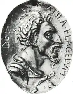 ![]() ميدالية عليها عبارة: "Atila, Flagelum Dei" (باللاتينية: " اتيلا، بلاء الله") | |