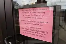 |CitationClass=تم تجاهله (مساعدة) - Parke, Caleb (13 March 2020). "Churches cancel Sunday service, move online amid coronavirus outbreak" (باللغة الإنجليزية). فوكس نيوز. مؤرشف من الأصل في 15 مارس 2020. اطلع عليه بتاريخ 16 مارس 2020. الوسيط