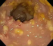 | تقيحات في القولون ناجمة عن التهاب القولون الغشائي الكاذب بسبب تناول المضادات الحيوية. |