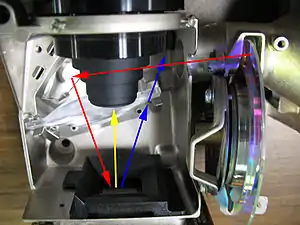 | نظرة داخلية إلى رقاقة واحدة من ال DLP الإسقاطي، والتي تبين مسار الضوء. الضوء الصادر من المصباح يدخل عكس فيش، يمر عبر دولاب الالوان، والصلبان تحت العدسة الرئيسية، ويعكس قبالة المرآة الأمامية للظهور، وينتشر على DMD (الأسهم الحمراء).من هناك، وإما يدخل ضوء العدسة (الصفراء) أو ينعكس قبالة أسفل إلى أعلى الغطاء الخفيف (الأسهم الزرقاء) ليعمل على امتصاص الضوء عند اللزوم لها. الصف الأعلى ويبين المكونات العامة، قريبة من 4 - الجزءعجلة الألوان RGBW، وبالوعة الضوء الناشر / العاكس على الغطاء العلوي. | |||