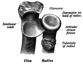 عظم الكعبرة اليسرى. يمكن رؤية الأحدوبة الكعبرية بارزة أعلى العظم ، أسفل العنق.