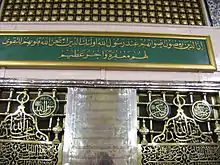 وفي واجهة ضريح النبي محمد وأبي بكر وعمر داخل المسجد النبوي عليها لوحة من الفضة هدية من السلطان العثماني أحمد الأول في القرن 11 هجري وضعت فوق باب التوبة في المواجهة الشريفة لوحة الفضة في المواجهة عليها ثبت مؤرخا في 1026 هجري غير واضح الآن شبه مطموس وهذا نصه: بسم الله الرحمن الرحيم : نبيء عبادي أني أنا الغفور الرحيم . يا أيها النبي إنا أرسلناك شاهدا ومبشرا ونذيرا وداعيا إلى الله بإذنه وسراجا منيرا وبشر المؤمنين بأن لهم من الله فضلا كبيرا.اللهم يارحمن بجاه هذا النبي الكريم اغفر لعبدك المنقاد لأحكام شريعة نبيك العظيم السلطان أحمد بن السلطان محمد بن السلطان مراد السلطان بن السلطان سليم بن السلطان سليمان بن السلطان سليم بن السلطان بايزيد ابن السلطان محمد بن السلطان مراد بن السلطان بايزيد بن السلطان مراد بن السلطان أورخان بن السلطان عثمان نصره الله نصرا عزيزا وفتح له فتحا مبينا. و"تاريخ الإهداء بحساب الجمل" ألهمت في تاريخه أهداه حبا خالصا 1026هـ. وكذلك كتب على جانبي اللوح لا إله إلا الله الملك الحق المبين محمد رسول الله الصادق الوعد الأمين.[4]