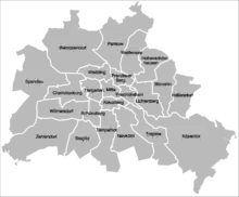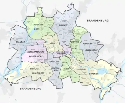 برلين هي مدينة واحدة من ولايات ألمانيا الاتحادية ( دولة مدينة ). منذ الإصلاح الإداري في عام 2001، كان يتألف من اثني عشر أو منطقة ( (بالألمانية: Bezirke) تلفظ ألماني: [bəˈtsɪʁkə] )، لكل منها حكومتها المحلية، على الرغم من أن جميع الأحياء تخضع لمدينة برلين وحكومة الولاية.