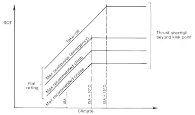 في الوقت الحاضر، تصنف المحركات النفاثة المدنية بخطوط تصاعدية مستوية على الدفع الصافي وصولا إلى "نقطة الانعطاف" (ظروف جوية معينة يبدأ الدفع الصافي بالثبات عندها). لذلك عند ظروف جوية معلومه، يظل الدفع الصافي ثابت تقريبا على مدى كبير من درجة الحرارة المحيطة، بزيادة درجة حرارة الدخول لتربينة الضغط المرتفع. و مع ذلك، تبقى درجة حرارة الدخول للتربينة ثابتة بعد نقطة الانعطاف، و يبدأ الدفع الصافي بالانخفاض مع زيادة درجة الحرارة المحيطة.[8] و بالتالي يجب تخفيض حمل الطائرة من الحمولة أو الوقود المخزن.