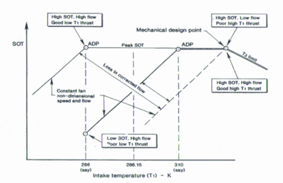 عند درجات حرارة الدخول المنخفضة، يميل المحرك للعمل عند الحد الأقصى للسرعة المصححة أو التدفق المصحح. عندما ترتفع درجة حرارة الدخول، يظهر تأثير القيود المفروضة على درجة حرارة الدخول لتربينة الضغط المرتفع، بانخفاض التدفق المصحح تدريجيا. و عند درجات حرارة الدخول الأكثر ارتفاعا، يظهر تأثير الوصول للحدود المسموحة لدرجة حرارة الخروج من الضاغط (T3) بانخفاض درجة حرارة الدخول للتربينة و التدفق المصحح.