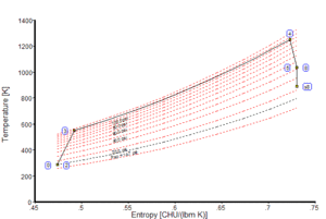 يشير ارتفاع درجة الحرارة في الضاغط على أنه سيكون هناك فقد في درجة الحرارة في التربينة (شغل أقل). في الحالة المثالية يكون الاجراء رأسيا على مخطط درجة الحرارة و الأنتروبي. بينما، في الاجراء الحقيقي، يؤدي احتكاك و اضطراب المائع إلى زيادة الفقد في الضغط عن الحالة المثالية. أي أنه كلما زاد الميل السالب على مخطط درجة الحرارة و الانتروبي، كلما أصبح تمدد المائع خلال التربينة أقل كفاءة (شغل أقل).