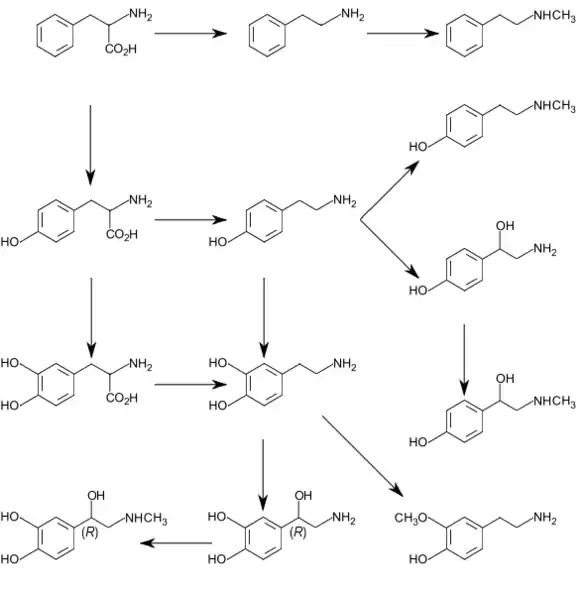 من الناحية الكيميائية يعد الأدرينالين واحداً من النواقل العصبية أحادية الأمين والتي تدعى الكاتيكولامينات. يصطنع الأدرينالين في الجسم بشكل أساسي داخل الخلايا أليفة الكروم في لب الغدة الكظرية، وكذلك في عدد صغير من العصبونات داخل النخاع المستطيل بواسطة مسار استقلابي يتحول فيه الحمضَين الأمينييَن فينيل ألانين وتيروسين إلى عدد من المركبات الوسطية المستقلَبة، وبالنهاية إلى الأدرينالين.[7][6][8] يُهَدرل التيروسين أولاً إلى ليفودوبا (L-DOPA) بواسطة هيدروكسيلاز التيروسين، وهي الخطوة المحددة لسرعة التفاعل. بعد ذلك يحدث تفاعل نزع كربوكسيل ليعطي الدوبامين بواسطة نازعة كربوكسيل L-الحمض الأميني العطري؛ ثم يحول الدوبامين إلى نورإبينفرين (نورأدرينالين) بواسطة إنزيم بيتا-هيدروكسيلاز الدوبامين، والذي يستخدم حمض الأسكوربيك (فيتامين سي) وأيونات النحاس عوامل مرافقة. تتضمن الخطوة الأخيرة في عملية الاصطناع الحيوي للادرينالين حدوث تفاعل مثيلة لمجموعة الأمين في النورأدرينالين. يحفر التفاعل الأخير بواسطة الإنزيم ناقلة ميثيل-N فينيل إيثانولامين (PNMT)، والذي يستخدم S-أدينوسيل الميثيونين (SAMe) مانحاً لمجموعة الميثيل.[9] في حين أن إنزيم ناقلة ميثيل-N فينيل إيثانولامين (PNMT) يوجد بشكل أساسي في العصارة الخلوية للخلايا الصماء في لب الغدة الكظرية؛ إلا أنه قد تم الكشف عنه بنسب ضئيلة في كل من القلب والدماغ.[10]