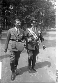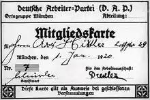كما التقى هتلر مع ديتريش إيكارت وهو واحد من المؤسسين الأوائل للحزب، كما كان عضوًا في الجمعية السرية المعروفة باسم "جمعية ثول".[53] وأصبح إيكارت المعلم الخاص بهتلر الذي يعلمه الطريقة التي يجب أن ينتقي بها ملابسه ويتحدث بها، كما قدمه إلى مجتمع واسع من الناس. ووجه هتلر عميق شكره إلى إيكارت عن طريق الثناء عليه في المجلد الثاني من كتابه المعروف باسم كفاحي. وفي محاولة لزيادة شعبية الحزب، قام الحزب بتغيير اسمه إلى حزب العمال الألماني الاشتراكي الوطني.