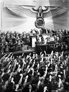 وباعتباره واحدًا من المحاربين القدامى الذين تقلدوا الأوسمة تقديرًا لجهودهم في الحرب العالمية الأولى بجانب ألمانيا، انضم هتلر إلى الحزب النازي في عام 1920 وأصبح زعيمًا له في عام 1921. وبعد سجنه إثر محاولة انقلاب فاشلة قام بها في عام 1923، استطاع هتلر أن يحصل على تأييد الجماهير بتشجيعه لأفكار تأييد القومية ومعاداة الشيوعية والكاريزما (أو الجاذبية) التي يتمتع بها في إلقاء الخطب وفي الدعاية.
