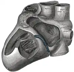 ![]() منظر أمامي لقلب مفتوح. الأسهم البيضاء تبين جريان الدم الطبيعي | |