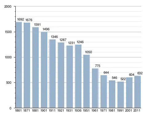 في سنة 1861 بلغ عدد السكان 1٬692 نسمة، وتطور العدد ليصل في سنة 2011 لـ 632 نسمة.