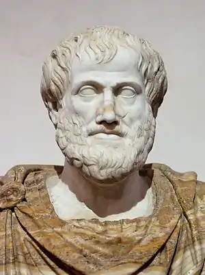 أَرِسْطُو (بالإغريقية: Ἀριστοτέλης) ( 384 ق.م - 322 ق.م ) أو أَرِسْطُوطَالِيس[20] أو أرسطاطاليس[21] هو فيلسوف يوناني وتلميذ أفلاطون ومعلم الإسكندر الأكبر. وهو مؤسس مدرسة ليسيوم ومدرسة الفلسفة المشائية والتقاليد الأرسطية، وواحد من عظماء المفكرين. تغطي كتاباته مجالات عدة، منها الفيزياء والميتافيزيقيا والشعر والمسرح والموسيقى والمنطق والبلاغة واللغويات والسياسة والحكومة والأخلاقيات وعلم الأحياء وعلم الحيوان.كان لفلسفته تأثير فريد على كل شكل من أشكال المعرفة تقريبًا في الغرب، ولا يزال موضوعًا للنقاش الفلسفي المعاصر.[22][23][24]