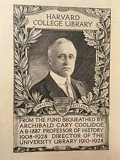 |CitationClass=تم تجاهله (مساعدة) - هارولد جيفرسون كوليدغ سينيور; Lord, Robert Howard: Archibald Cary Coolidge: life and letters, 1932 (reprinted 1971), (ردمك 0-8369-6641-4). URL retrieved 2011-01-11. "نسخة مؤرشفة". Archived from the original on 4 يناير 2020. اطلع عليه بتاريخ 30 مايو 2020. الوسيط