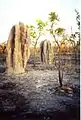 Two cathedral mounds in a سافانا، شجيرات، وأراضي عشبية استوائية وشبه استوائية blackened by حديقة كاكادو الوطنية 's annual winter حرائق الغابات في أسترالياs.