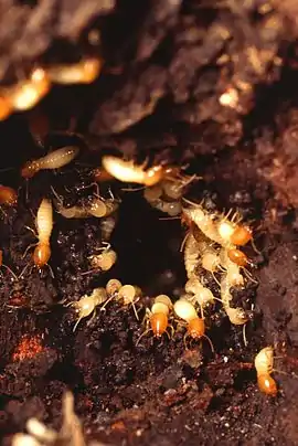 ![]() مجموعة من جنود الأرضة (ذو الراس الأحمر) وعمال الأرضة (ذو الراس الأبيض) | |