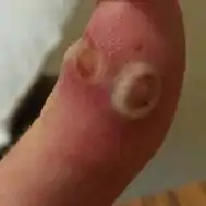 يبدأ بحطاطة صغيرة حمراء مزرقة تتطور إلى عقيدة مركزها أبيض ومحيطها أحمر مسررة في مركزها قطرها 1 أو 2 سم
